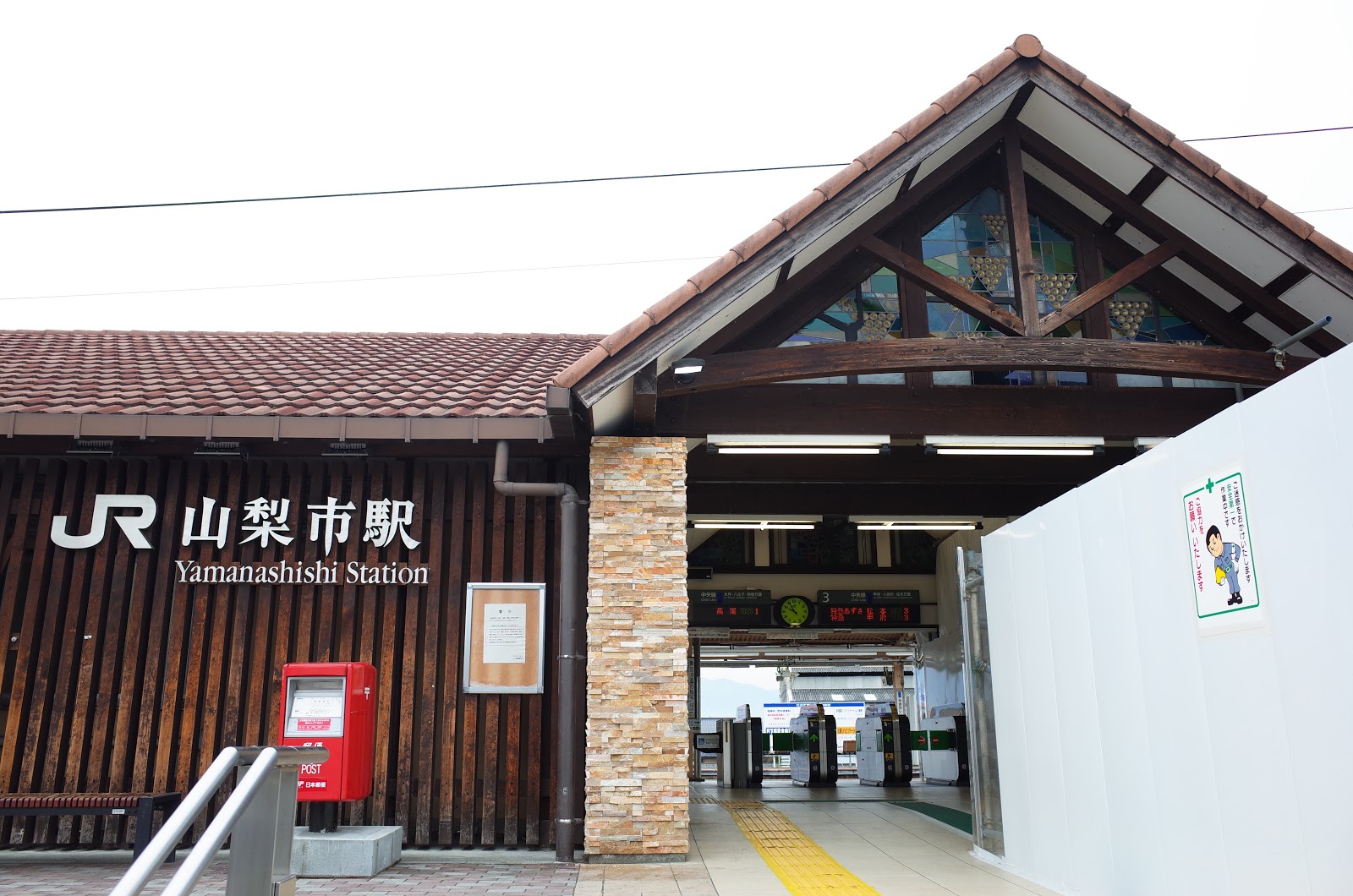 改札の上の看板に、山梨市の観光地として笛吹川フルーツ公園(新日本三大夜景)の文字がありますね。観光地として力を入れられているようなので、期待できそうです。